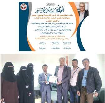 تقدم المشاركين في الدورة التدريبية لموجهي ومعلمي جهاز محو الأمية الخاصة بلغة الإشارة ؛ بشهادة شكر وعرفان للاستاذ فؤاد عبد الله الشامي رئيس جهاز محو الأمية وتعليم الكبار ؛ على كل ما يبذله وما يرسمه من لمسات ومبادرات هامة تساهم في تحقيق آمال وتطلعات موظفي ومنتسبي الجهاز وحرصه المستمر على تنمية المهارات والقدرات الفردية والجماعية لموظفي الجهاز .