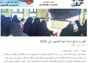 وقال التقرير بأن العدوان على اليمن الذي أنطلق مارس 2015، تسبب في ارتفاع نسبة الأمية من 45% إلى 65%، بما يحمله من آثار سلبية وتداعيات اجتماعية واقتصادية على المجتمع في بلد يصنّف ضمن الأفقر في العالم.