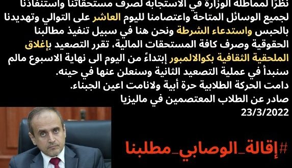 ونظرًا لمماطلة الوزارة في الاستجابة لصرف هذه المستحقات واستنفاذ الطلاب لجميع الوسائل المتاحة والاعتصام لليوم العاشر على التوالي في مبنى الملحقية الثقافية في كوالالمبور بماليزيا وتهديدهم بالحبس واستدعاء الشرطة وهم سبيل تنفيذ مطالبهم الحقوقية وصرف كافة المستحقات المالية، فإن الطلاب قد قاموا بإغلاق الملحقية الثقافية بكوالالمبور إبتداءً من الأربعاء إلى نهاية الأسبوع مالم ستكون هناك عملية تصعيد ثانية سيعلن عنها في حينه.