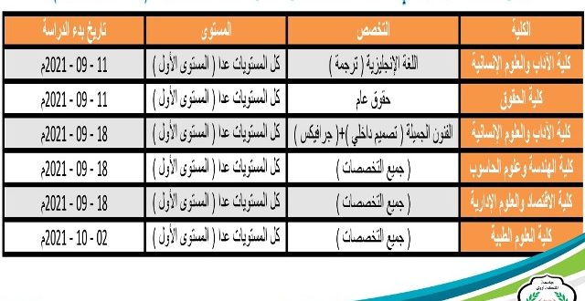 ( جميع التخصصات ) كل المستويات عدا ( المستوى الأول ) من تاريخ 18 – 09 – 2021 م