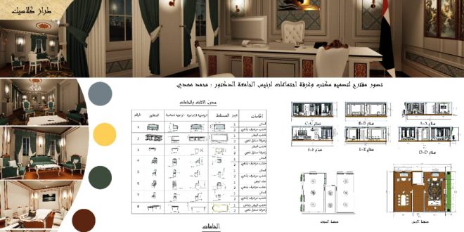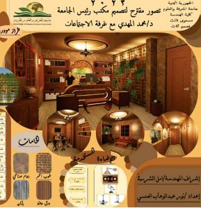 تم يوم الاثنين ٢٢ ربيع الثاني ١٤٤٥هجرية الموافق ٦ نوفمبر ٢٠٢٣م تسليم مشاريع مادة تصميم أثاث لطلاب هندسة ديكور داخلي مستوى ثالث وذلك تحت إشراف م.أمل الشرفي التي ظهر مجهودها في مشاريع الطلاب التي تم تقديمها. تتناول مادة تصميم أثاث الأنماط المختلفة التي يتم تصميم قطع الأثاث على ضوئها حيث ان الأثاث يعتبر من العناصر الرئيسية والهامة في تصميم المساحات الداخلية ومن دونه لا تكتمل مقومات التصميم الداخلي، فهو يعتبر الوسيط بين المستخدمين والمبنى وكان المشروع عبارة عن تصور مقترح لتصميم اثاث وتصميم ديكور داخلي متكامل لمكتب رئيس الجامعه الدكتور (محمد مهدي ) مع غرفة الاجتماعات التابعة للمكتب