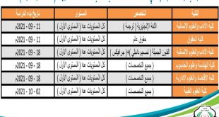 شبكة أخبار التعليم/ صنعاء أعلنت جامعة الملكة أروى بصنعاء لطلابها الكرام، عن موعد بدء الفصل الدراسي الأول من العام الجامعي 2022/2021 م والتي ستكون بمشيئة الله كما يلي توضيحه :- – كلية العلوم الطبية :- ( جميع التخصصات ) كل المستويات عدا ( المستوى الأول ) من تاريخ 02 – …