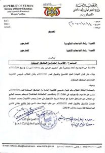 اصدرت وزارة التعليم العالي والبحث العلمي بصنعاء ، تعميما وزاريا للجامعات الحكومية والاهلية  بخصوص قبول الطلبة من خريجي الثانوية في المحافظات الجنوبية والمناطق المحتلة .