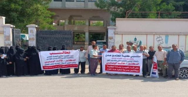نفذ منتسبي كلية المجتمع بعدن صباح اليوم الثلاثاء وقفة احتجاجية أمام بوابة الكلية ورفعوا فيها اليافطات يطالبون فيها وزير التعليم العالي والتعليم الفني والتدريب المهني بعدن ونائبه بسرعة تنفيذ قرار تغيير عميد الكلية ، وطالبوا كذلك حماية رواتبهم من الاستقطاعات التي قامت بها عمادة الكلية لشهر نوفمبر مشيرين بأن العمادة عملت على الاستقطاع من رواتبهم بشكل تعسفي وانتقامي .