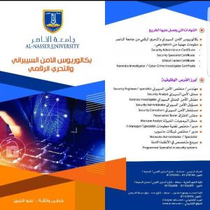 سجل بجامعة الناصر  كلية الحاسوب بكالوريوس الذكاء الاصطناعي والأمن السيبراني والتحري الرقمي و علوم البيانات .