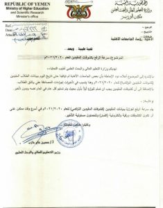 شبكة أخبار التعليم / صنعاء اصدرت وزارة التعليم العالي والبحث العلمي ، تعميم هام للجامعات الأهلية بسرعة موافاة الوزارة بكشوفات المقيدين للعام20/21 .