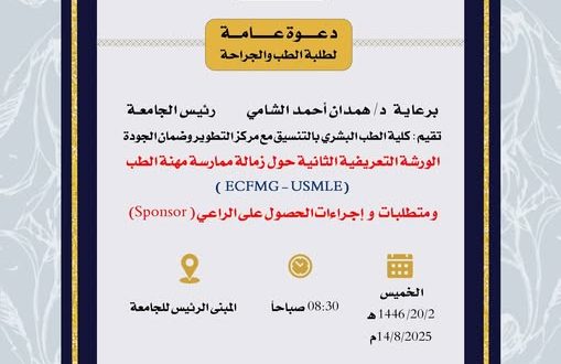 برعاية د. همدان أحمد الشامي، رئيس جامعة الجيل الجديد، تقيم كلية الطب البشري بالتنسيق مع مركز التطوير وضمان الجودة، الورشة التعريفية الثانية حول زمالة ممارسة مهنة الطب (ECFMG-USMLE) ومتطلبات وإجراءات الحصول على الراعي (Sponsor).