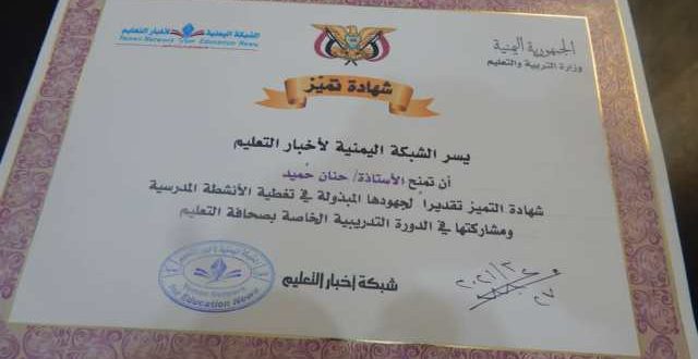 منحت الشبكة اليمنية لأخبار التعليم، اعلامية مدارس الطريق إلى القمة (يمن الشموخ – سابقا) الأستاذة حنان حميد، شهادة شكر وتقدير ، نظير جهدها الاعلامي المتميز في تغطية الفعاليات والأنشطة المدرسية المختلفة لمدارس الطريق إلى القمة