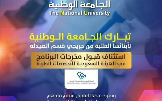 الرئيسية / تعليم عالي / الجامعة الوطنية تبارك لطلبة الصيدلة تجديد قبول البرنامج من الهيئة السعودية للتخصصات الطبية
