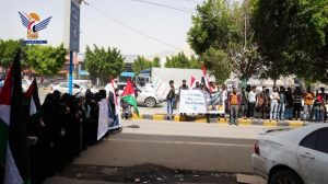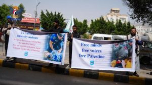 نظم طلاب ومنتسبو جامعة الرازي وملتقى الطالب الجامعي بصنعاء، اليوم، وقفة تنديداً باستمرار المجازر الصهيونية في قطاع غزة، وتضامناً مع طلاب الجامعات الأمريكية والأوروبية، الذين يتعرضون للقمع والتعذيب جراء مواقفهم المنددة بالمجازر الصهيونية التي ترتكب بحق الفلسطينيين في قطاع غزة.