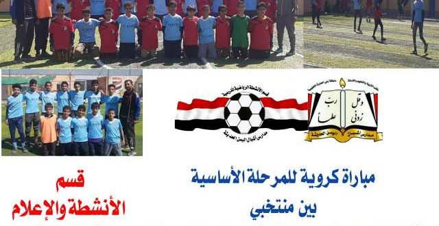 حيث إلتقى يوم الثلاثاء منتخب مدارس أشبال اليمن الحديثة للمرحلة الأساسية مع نظيرة منتخب مدارس أبناء اليمن الحديثة في مباراة ودية أخوية شهدت النديه واللمسات الفنية والحماس مع سيطرة واضحة لمنتخب أشبال اليمن .