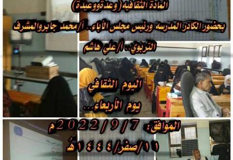 استمع الكادر التربوي بمدرسة الشهيد يحيى المتوكل ، للمادة الثقافية التي تقام كل أربعاء من كل أسبوع .
