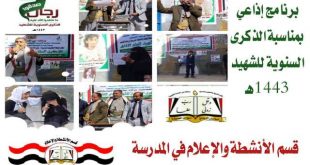 شبكة اخبار التعليم / عواد صالح الطيري “تحت شعار يحيا الشهيــد”، أقامت مدارس أشبال اليمن الحديثة برنامج اذاعي بمناسبة الذكرى السنوية للشهيد . حيث تخلل البرنامج الاذاعي العديد من الفقرات المميزه والمتنوعة وقدألقت أم الشهيد انور العصري الأستاذة /سميره رسام مدرسة الإجتماعيات في المدرسة والتي قدمت أحد أبنائها فداءً لهذا …