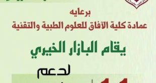 أكمل القراءة »طلاب كلية الآفاق يقيمون بازار خيري لصالح مرضى السرطان تحت شعار “”سأبدأ عامي بخير””