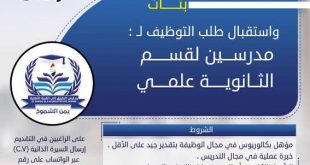 شبكة اخبار التعليم / صنعاء  بمناسبة افتتاح قسم الثانوية للبنات بمدارس الطريق إلى القمة “يمن الشموخ” ، تُعلن إدارة المدارس عن استقبال طلبات التوظيف لمعلمين القسم العلمي. شروط التوظيف :- – مؤهل بكالوريوس في مجال الوظيفة بتقدير جيد على الأقل – خبرة علمية في مجال التدريس – التأهيل الكافي بأساليب …