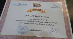شبكة اخبار التعليم / صنعاء منحت الشبكة اليمنية لأخبار التعليم، اعلامية مدارس الطريق إلى القمة (يمن الشموخ – سابقا) الأستاذة حنان حميد، شهادة شكر وتقدير ، نظير جهدها الاعلامي المتميز في تغطية الفعاليات والأنشطة المدرسية المختلفة لمدارس الطريق إلى القمة خلال العام الدراسي 2020-2021 م ، ومشاركتها في الدورة التدريبية …