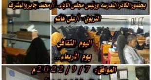 شبكة اخبار التعليم / سماهر الريدي استمع الكادر التربوي بمدرسة الشهيد يحيى المتوكل ، للمادة الثقافية التي تقام كل أربعاء من كل أسبوع . كانت المادة الثقافية لهذا الأسبوع بعنوان “معرفة الله ووعده ووعيده” . وقد كانت الكلمة عن عظمة الله سبحانه وتعالي ، و عن القضايا التي تعنينا، الرحة …